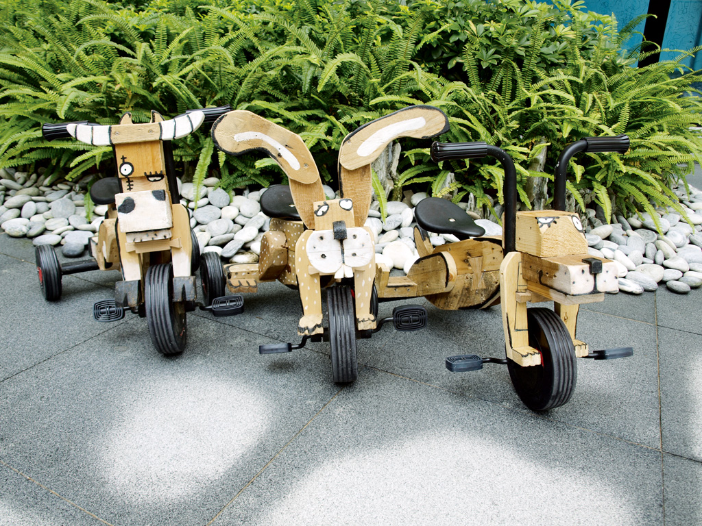 透過動物三輪車這作品,一方面打破傳統欣賞藝術品的經驗,也希望吸引孩子從小拉近和藝術品的接觸,以身體感受和參與一件藝術品。